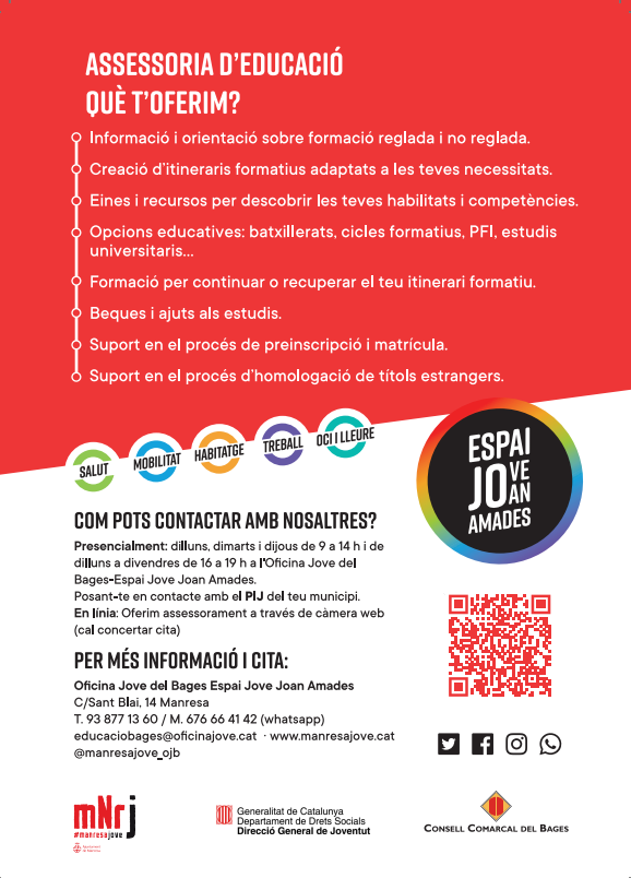 L’Assessoria d’Educació és una eina per als joves de la ciutat de Manresa i Comarca que no tinguin massa clar quin camí escollir en el camp educatiu, o que vulguin reenganxar-se en el món formatiu. L'assessorament és individualitzat, i s'hi pot contactar per diferents vies: